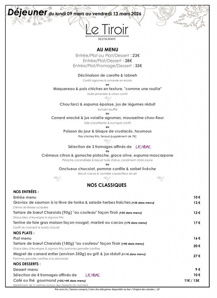 Dîner du Samedi 14 février : 90€ ttc /personne (hors boissons)